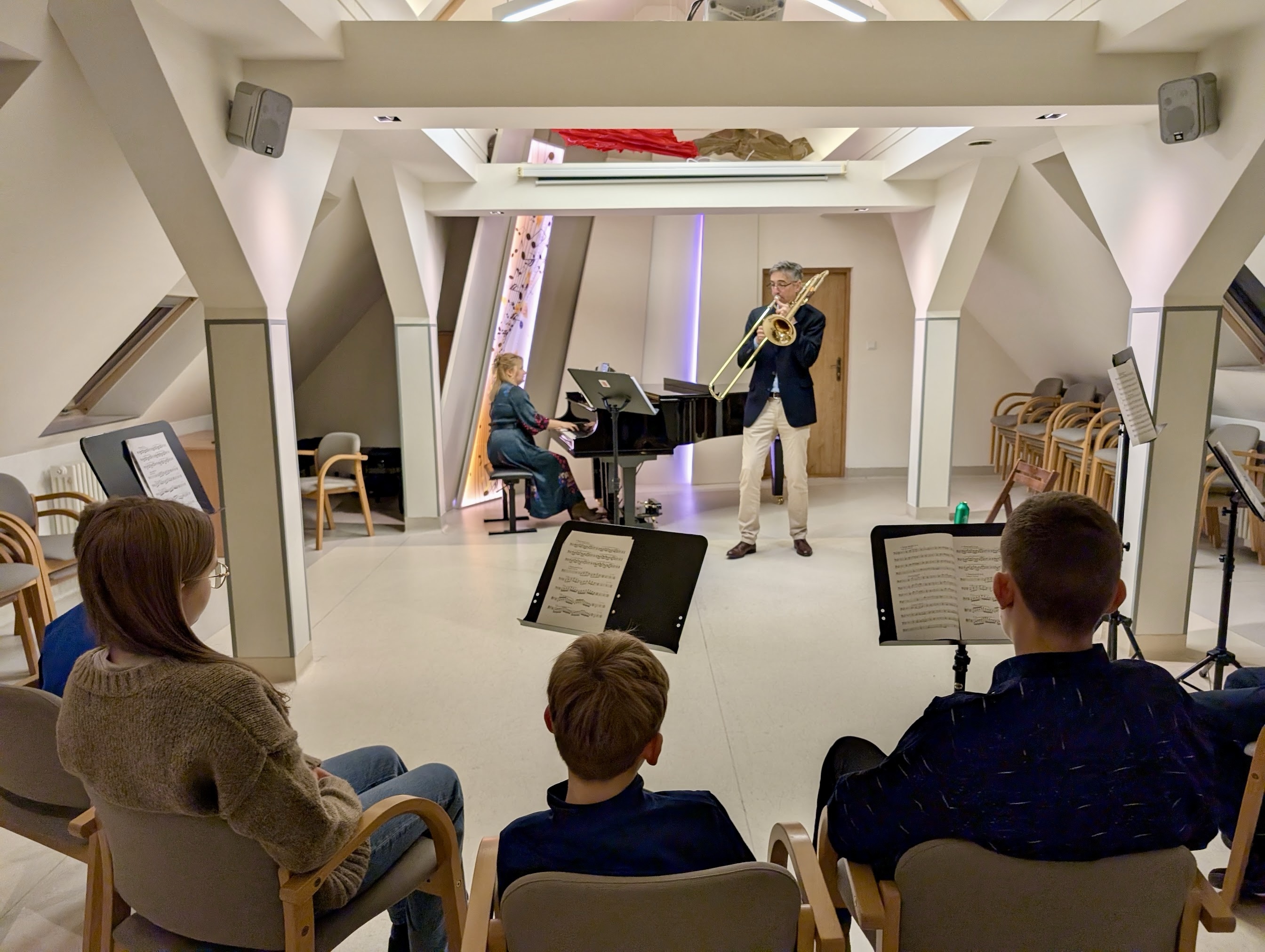 After the recital and a short break, I had the pleasure of working one-on-one with the members of the trombone studio. We focused on various playing aspects, including proper posture, the use of continuous air, artistic choices, and phrasing.