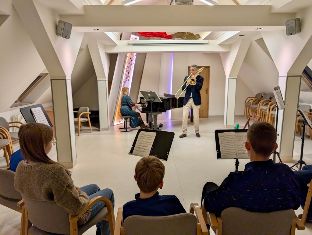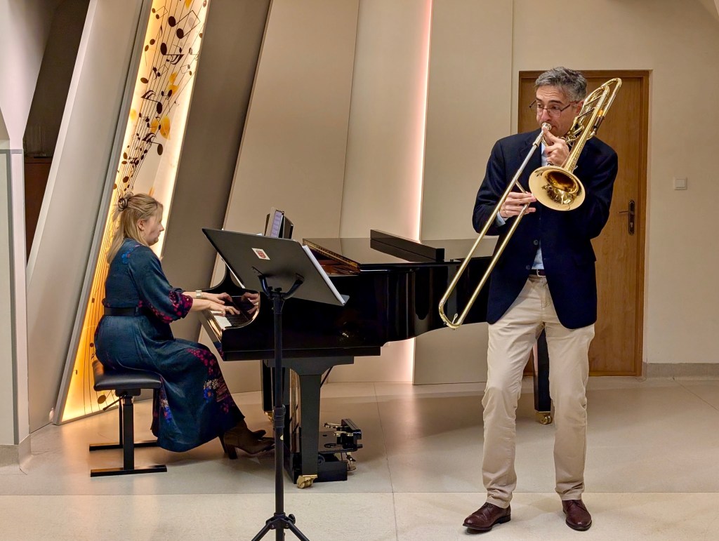 In the evening, I had the chance to perform a short recital, joined by the school’s trombone quartet. My performance featured works by Jorgensen, Galliard, and Low, each piece offering distinct textures and expressive opportunities as well as demonstrating the range and capabilities of the instrument as a solo voice. Sharing the stage with such promising young artists was a real highlight.